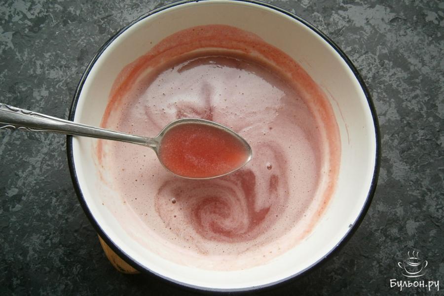 6. Клубничную смесь процедить через сито в миску или кастрюльку, поставить на огонь. Довести смесь до кипения, но не кипятить, добавить желатин. Все тщательно размешать - желатин обязательно должен раствориться.
