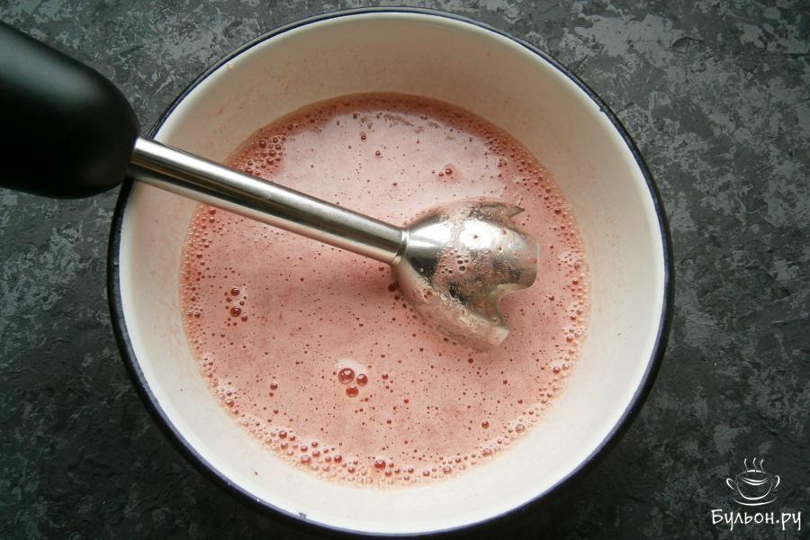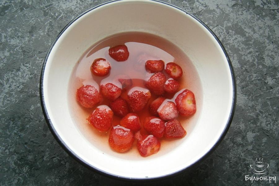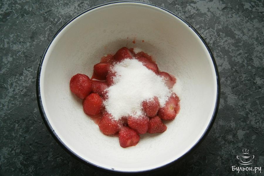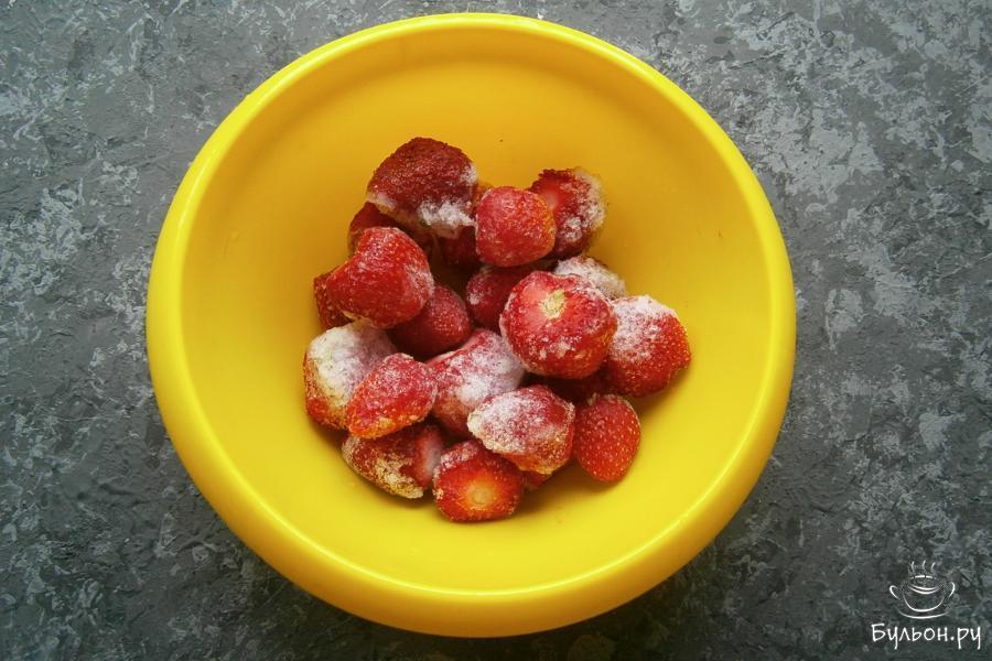 1. Клубнику мороженную выложить в миску и оставить минут на двадцать при комнатной температуре. Она должна немного разморозиться, но не до конца.