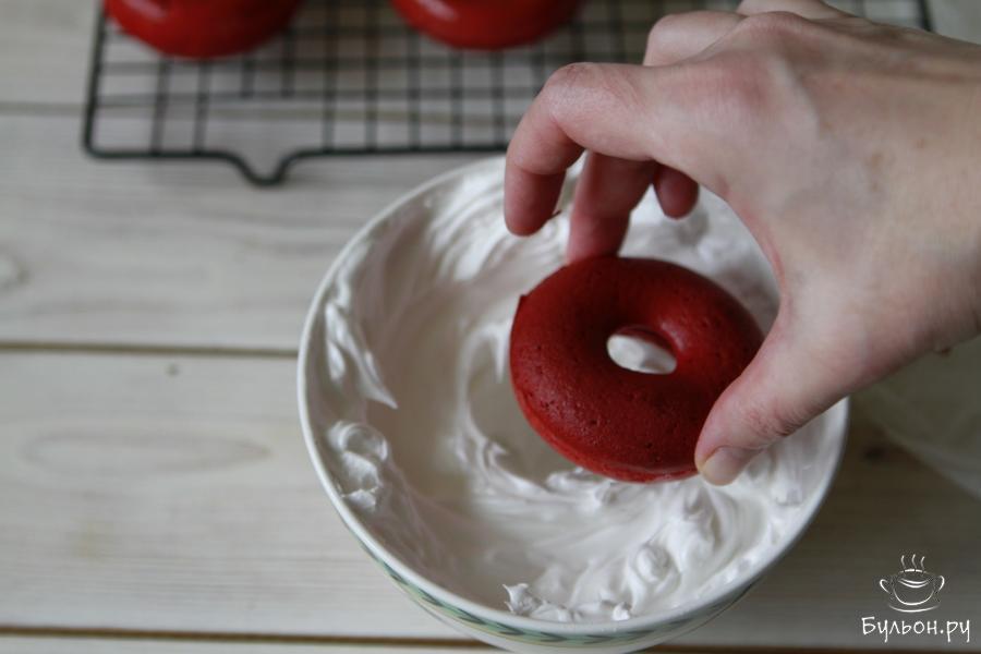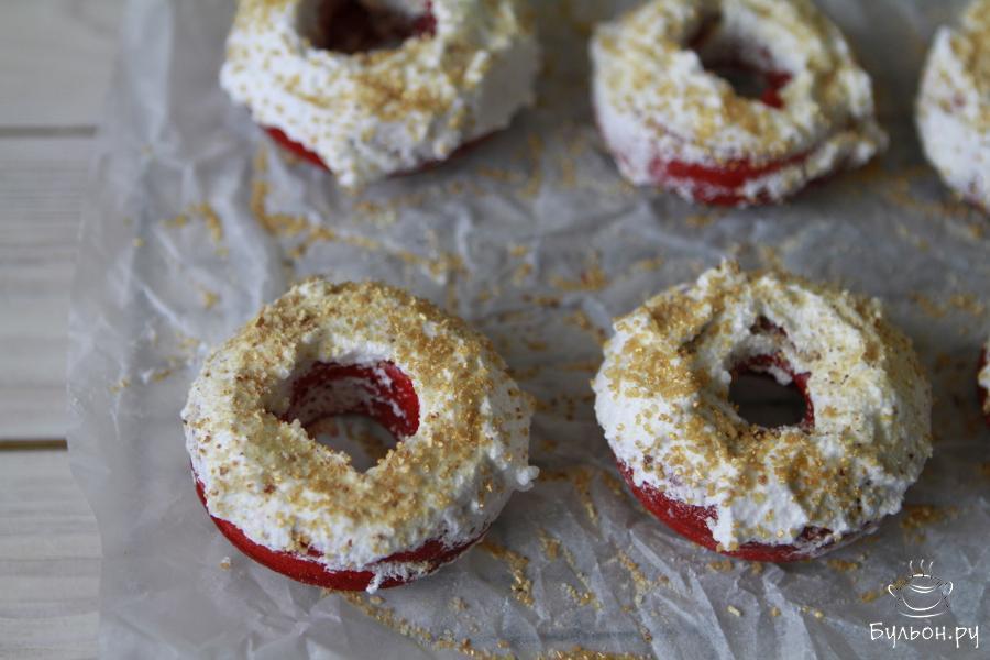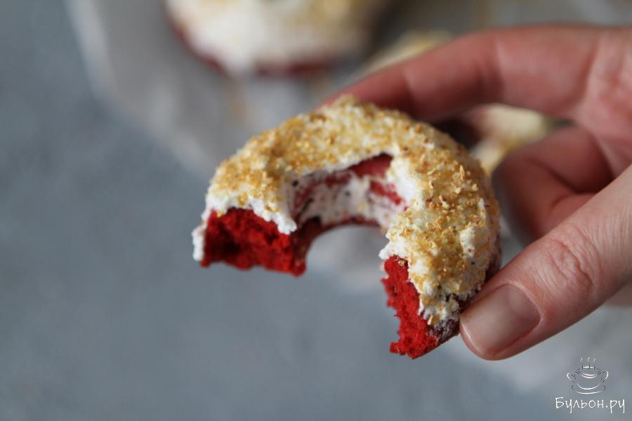 "Красный бархат" - это классика американской кухни. Рецепт этого десерта сочетает в себе загадочность, страсть, влюбленность. Именно поэтому этот десерт чаще всего готовят ко Дню влюбленных. Изюминкой считается его цвет, он насыщенный красный. Основными ингредиентами этого десерта является пахта, масло, мука, краситель (он может быть и натуральный, например, сок свеклы). Зная основу можно слегка разнообразить десерт, например испечь кексы или пончики в духовке или мультипекаре. А почему бы и нет. Печеные пончики "Красный бархат" по вкусу ничем не уступают торту. Пончики также имеют шоколадный вкус и мягкий, воздушный бисквит. Крем для пончиков можно приготовить из творожного сыра с добавлением сливок, белковый или шоколадный. И украсить по своему усмотрению. Приготовьте этот десерт и удивите свои вторые половинки.