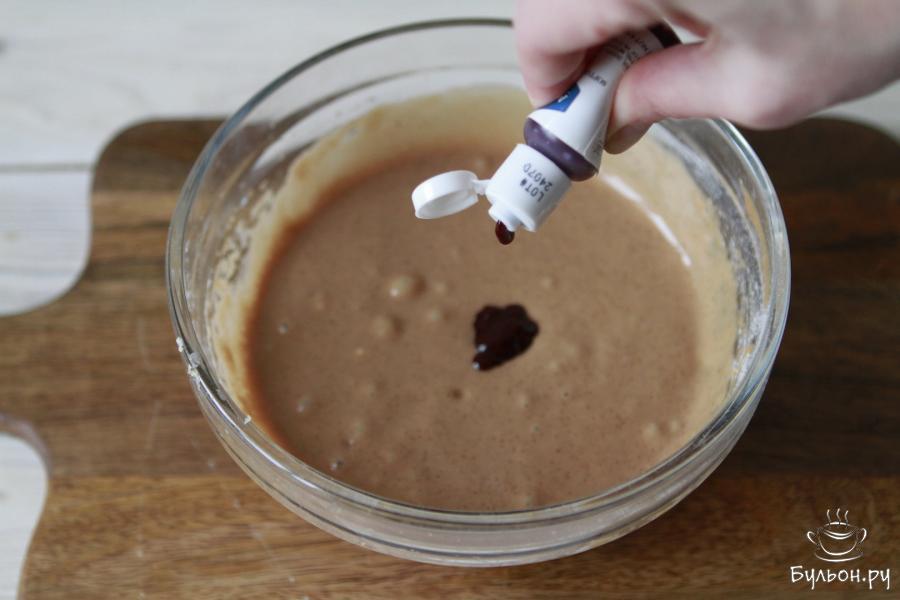 4. Ручным миксером или венчиком вручную хорошо все взбить, чтобы в тесте не было комочков. Добавить жидкий красный пищевой краситель.