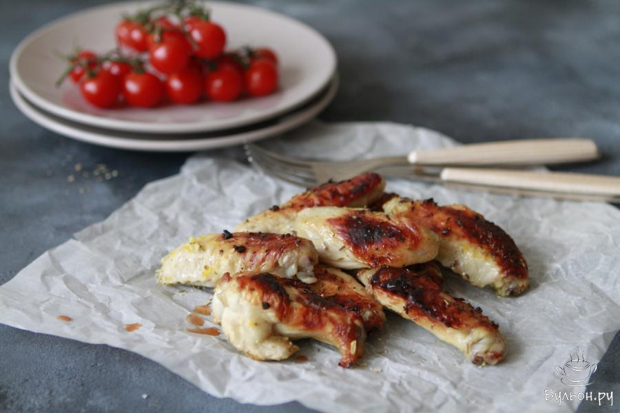 7. Духовку разогреть. Выставить режим гриль, примерно 210 градусов. Запекать 30-40 минут до приятной румяной корочки. Куриные крылышки в цитрусовом маринаде готовы. Приятного Вам аппетита.