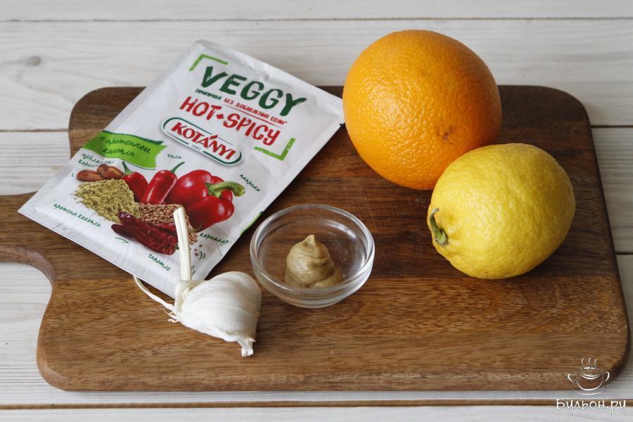 2. Для маринада приготовить следующие ингредиенты: один лимон, один апельсин, горчицу, чеснок и травы.