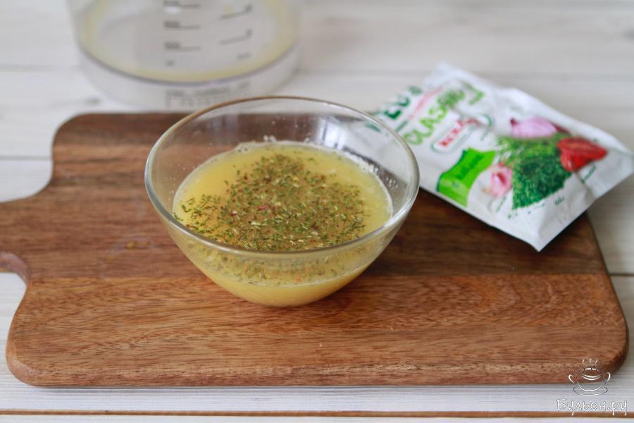 4. Из одного лимона и апельсина выжать сок. Чеснок мелко порубить, смешать с горчицей. Добавить оба ингредиента и сухие травы в цитрусовый сок.
