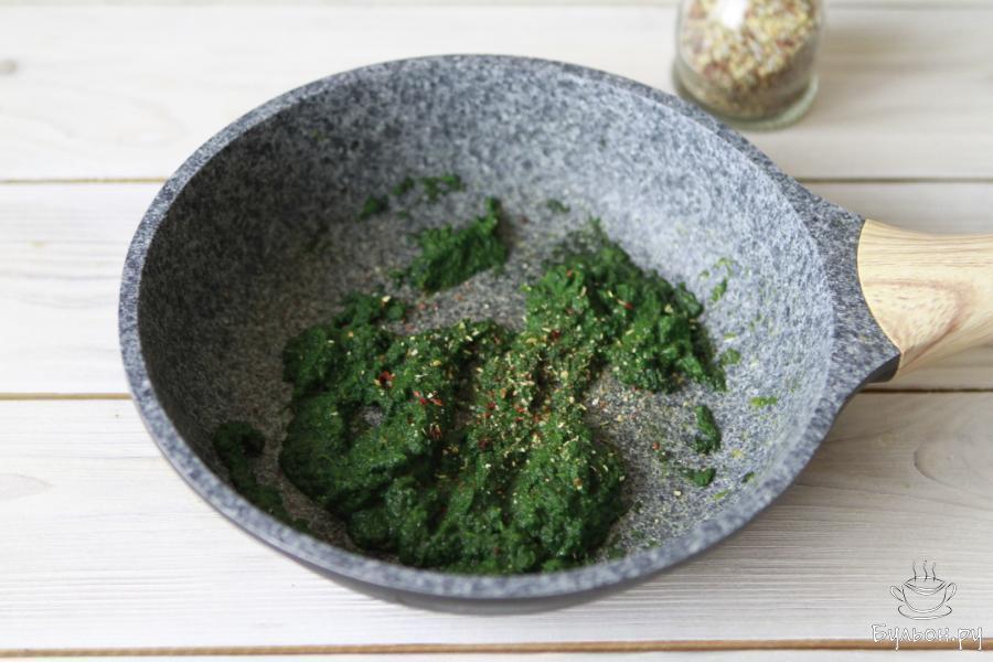 3. Как только шпинат будет готов и испарится вся жидкость добавить по вкусу любимые травы и немного соли.