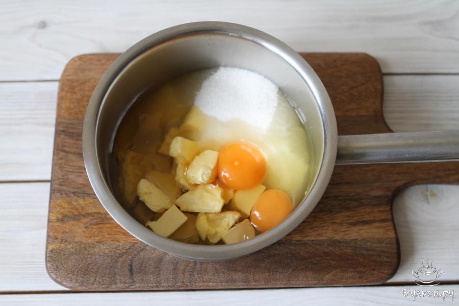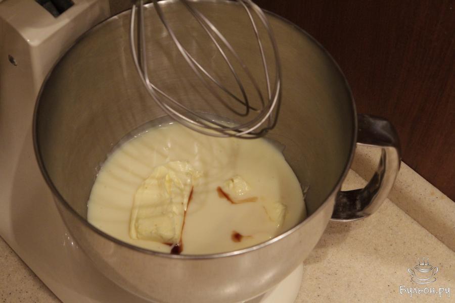 11. В чашу миксера переложить 200 гр сливочного масла, сгущенное молоко и ром. Взбивать крем на максимальной скорости 5-7 минут.