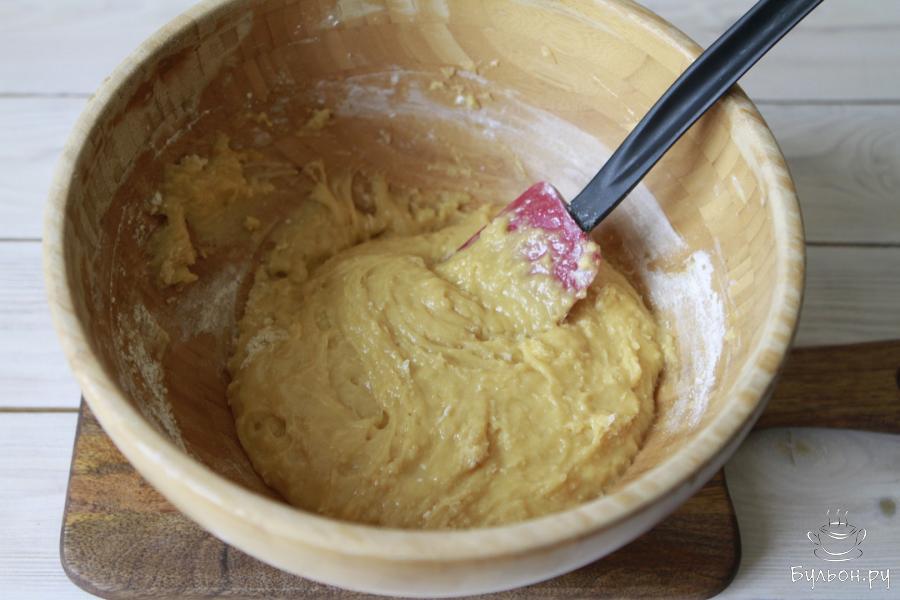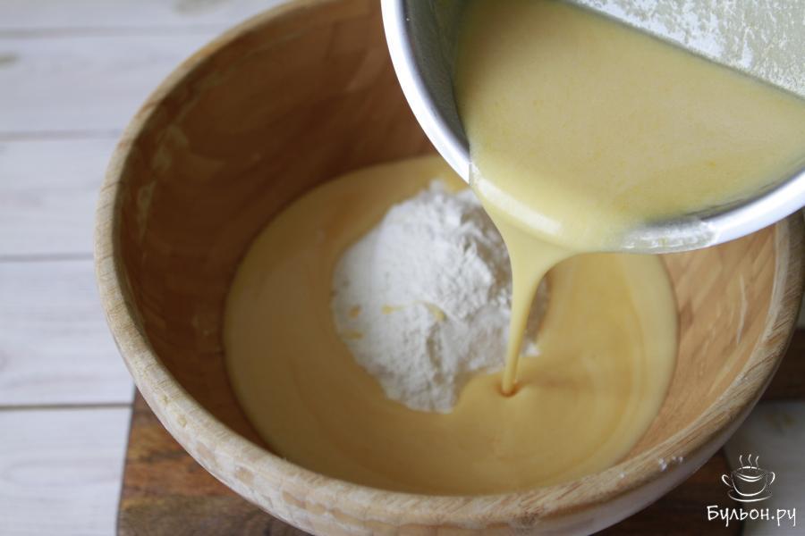 4. В чашу просеять примерно 300 грамм пшеничной муки, добавить всю миндальную муку и ввести масляно-медовую смесь.
