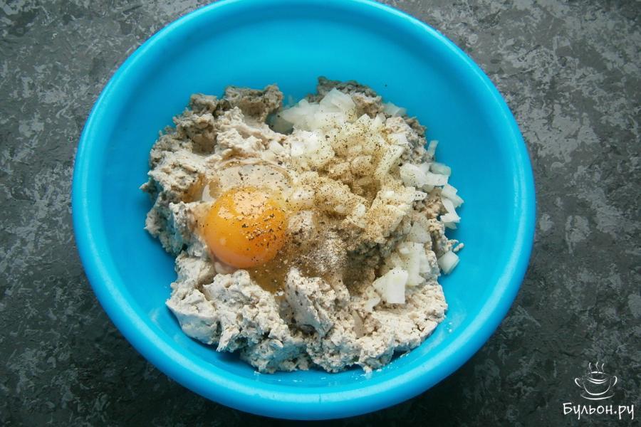 2. Если фарш заморожен, разморозить его, выложить в миску. Добавить мелко порезанный лук и сырое яйцо. Также, добавить немного приправы, перец и, если понадобится, соль.