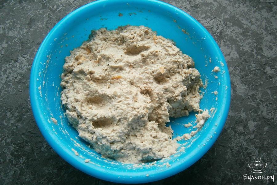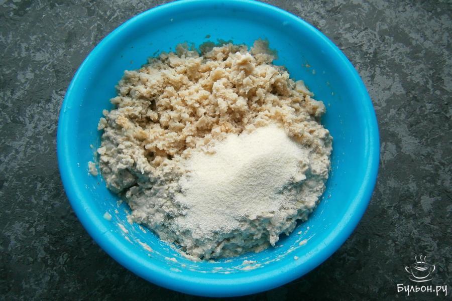 3. Хорошо все перемешать, добавить размоченный в воде или молоке и тщательно отжатый хлеб и всыпать манку.