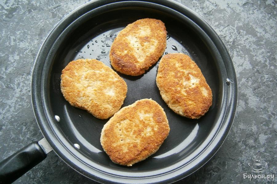 6. Сковородку обязательно разогреть с любым растительным маслом, поместить в нее котлеты. Жарить их на достаточно умеренном огне пока котлеты не зарумянятся с обеих сторон.