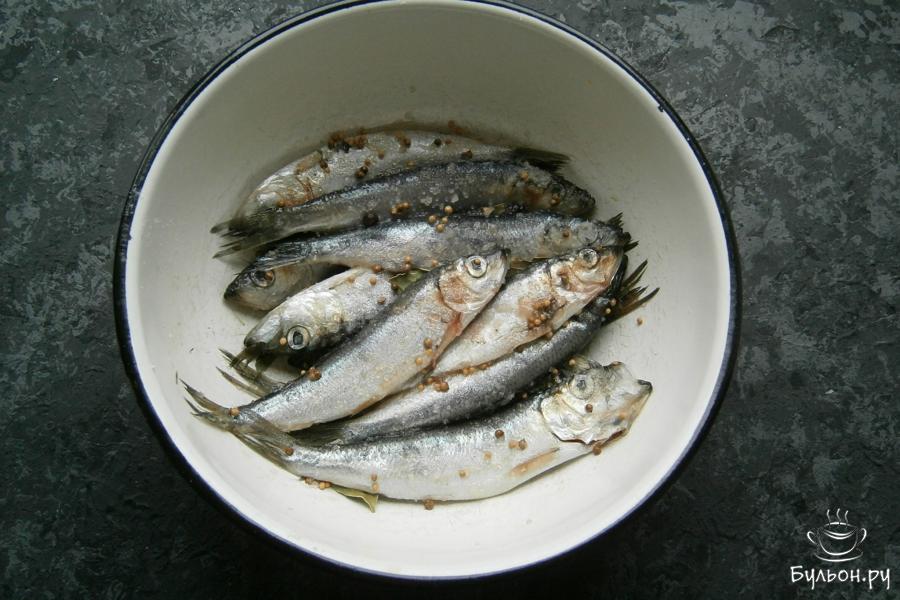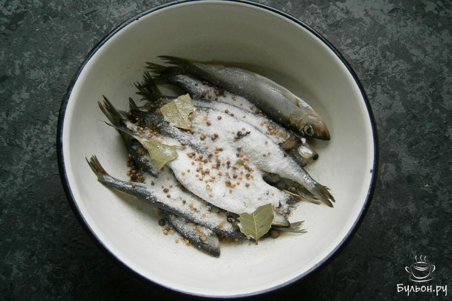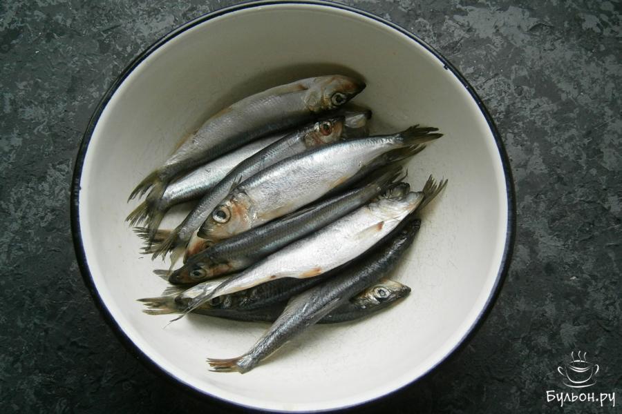 1. Салаку промыть проточной водой, немного обсушить, сложить в глубокую посуду. Если рыбы была заморожена, предварительно ее нужно разморозить.