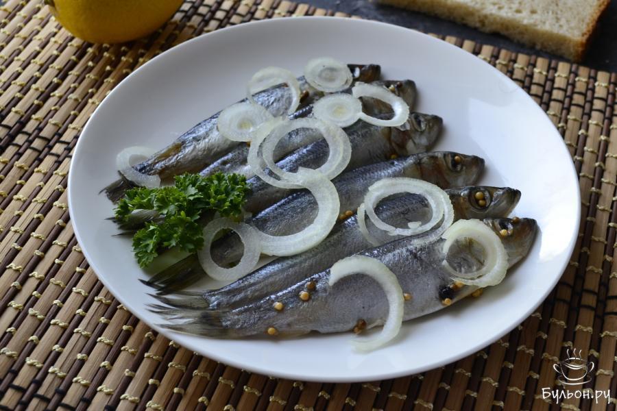 6. К утру рыбка будет полностью просолена, ее можно выложить на тарелку, посыпав кольцами лука. Приятного аппетита.