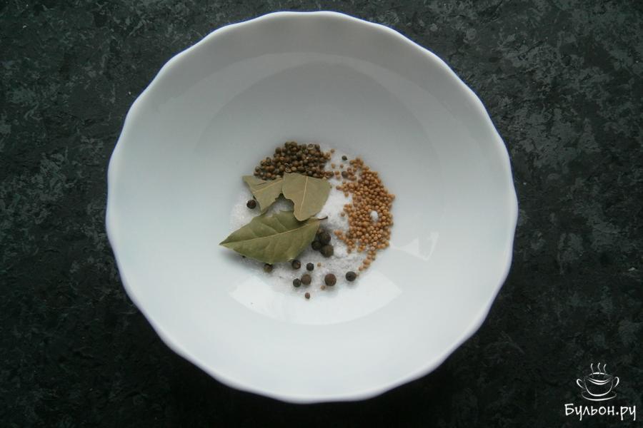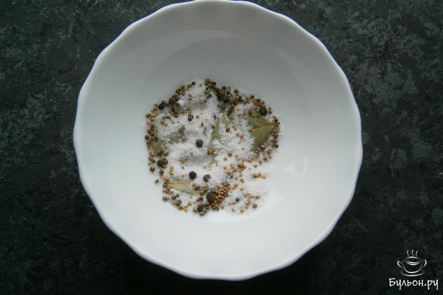 2. Смешать соль с зернами горчицы и кориандра, с сахаром, добавить душистый и черный перец, а также, пару лавровых листиков.