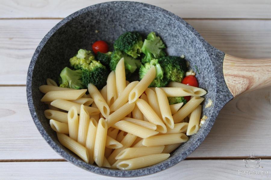 5. Параллельно отварить макароны в слегка подсоленной воде согласно инструкции на упаковке. Слить воду, оставив 30-40 мл. Макароны добавить к овощам, влить немного воды, в которой они варились. Все хорошо перемешать и оставить на огне на 2 минуты.