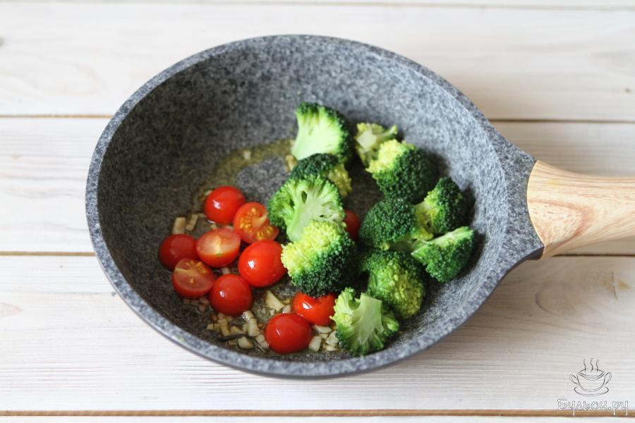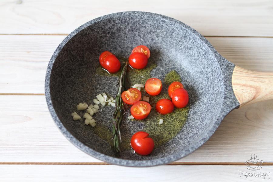 3. На оливковом масле обжарить мелко рубленный чеснок и половинки помидорок черри с веточкой розмарина.