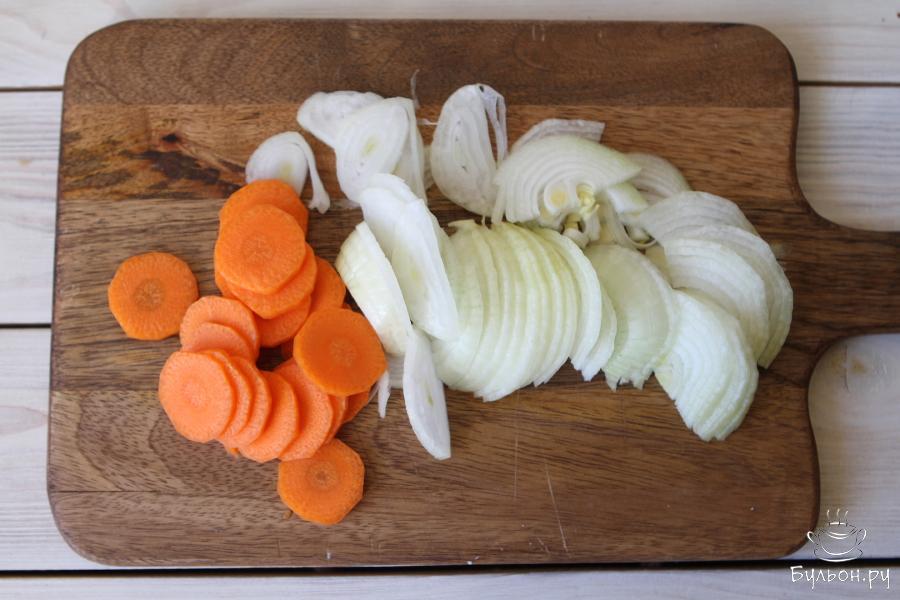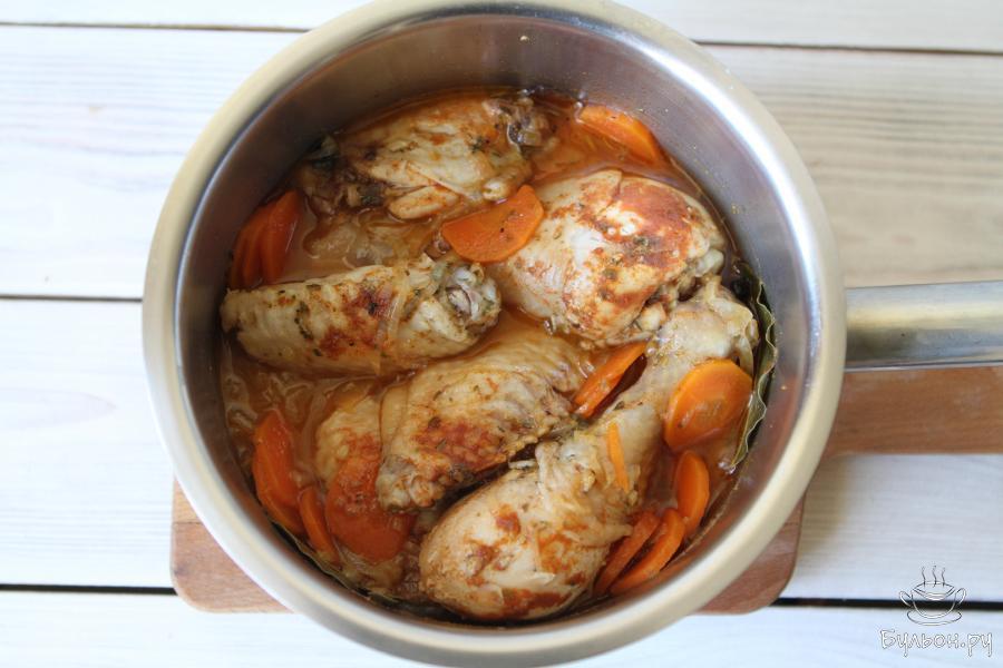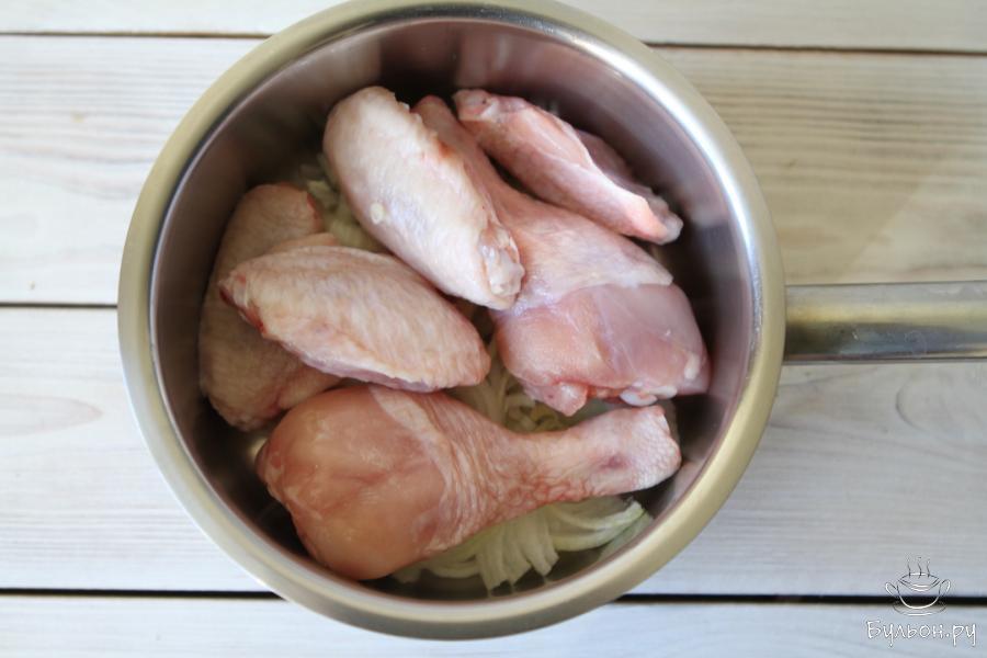 3. На дно кастрюли положить кусочек сливочного масла, лук, а поверх выложить голень и крылья куриные.