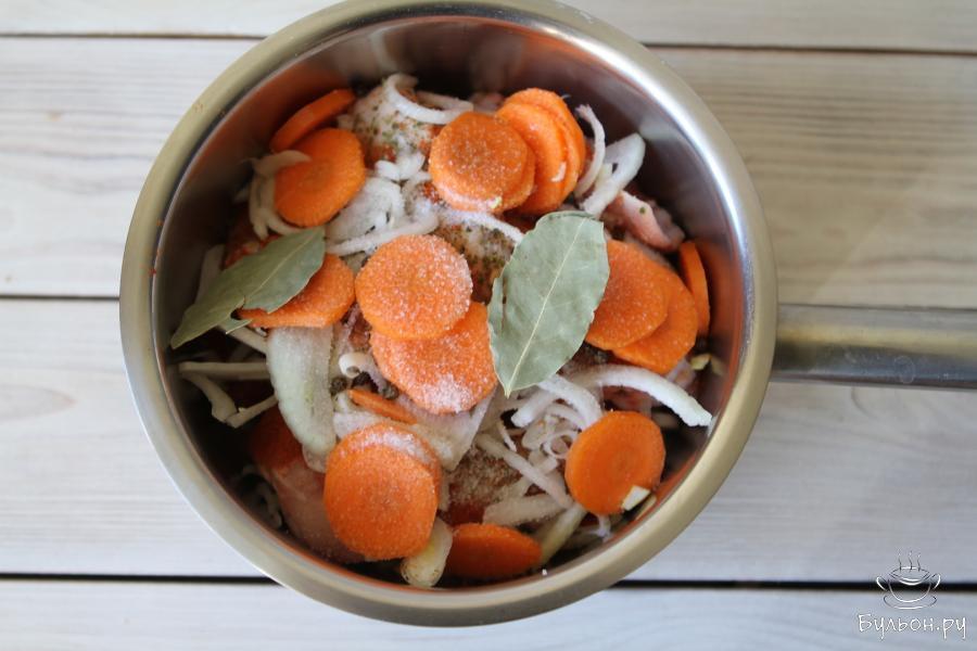 6. Кастрюлю закрыть крышкой и отправить на плиту. Тушить на медленном огне, не перемешивая и не открывая крышку ровно час.