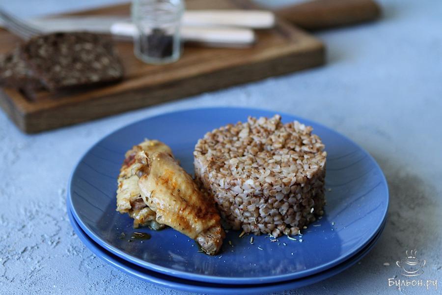 Гречка с курицей - обыденное блюдо и приготовить его можно по-разному. Рецепт этого блюда несложный, но и имеет свою изюминку. И изюминкой является паприка с травами. Части курицы: крылья и голень тушат со специями на медленном огне. Курица получается нежной и очень мягкой за счет собственного сока. Ну а специи придают особый аромат блюду, паприка еще и цвет. Блюдо не получается жирным.