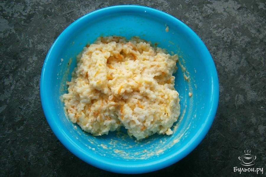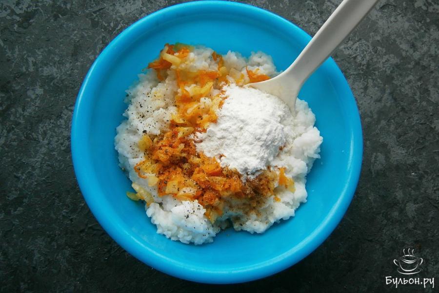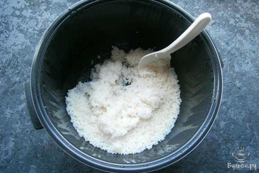 2. Залить рис водой и отварить до готовности. Для мультиварки - выставить режим "молочная каша" на 50 мин. Готовый рис должен быть не рассыпчатым, немного вязким. Дать рису остыть.