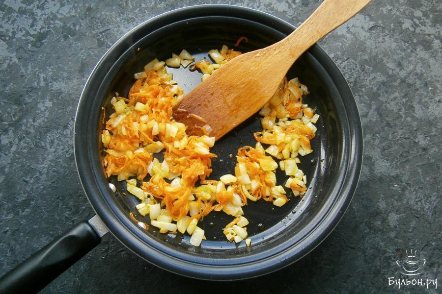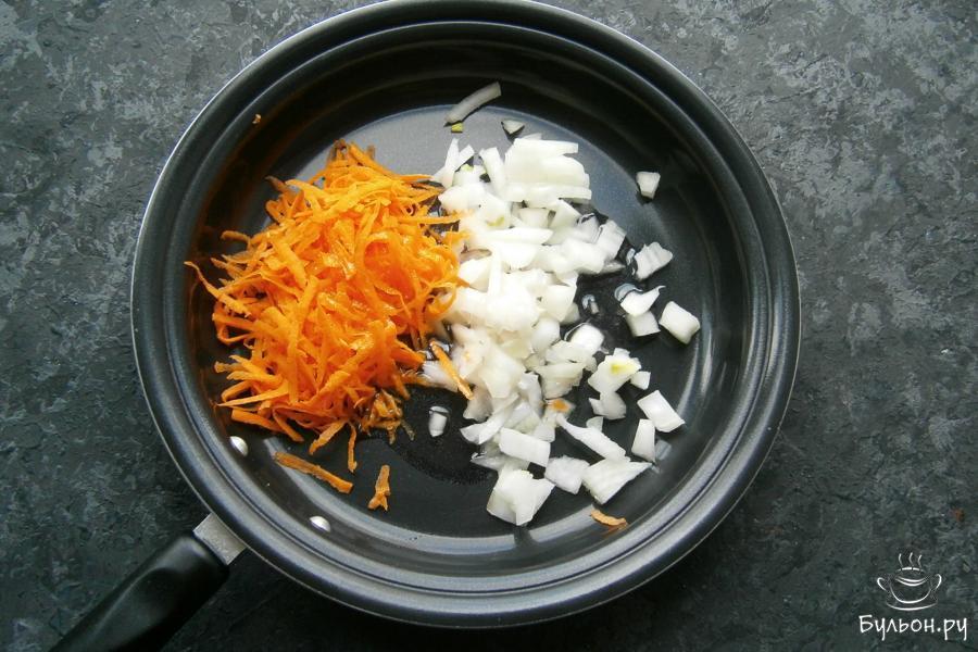 3. Лук мелко порезать, морковку натереть, поместить овощи в сковороду, влить 3 ст. л. растительного масла.