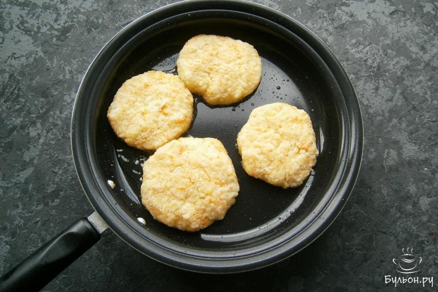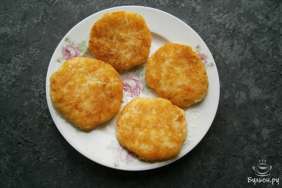 10. Жарить их на умеренном, среднем огне до румяной корочки снизу, после чего котлетки перевернуть и также, обжарить до золотистости. Переворачивать их нужно аккуратно - очень нежные.