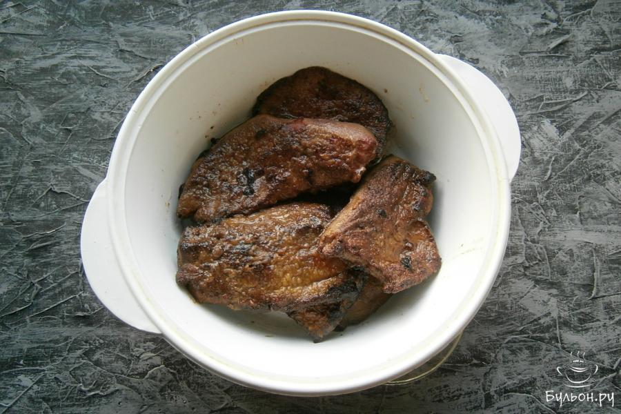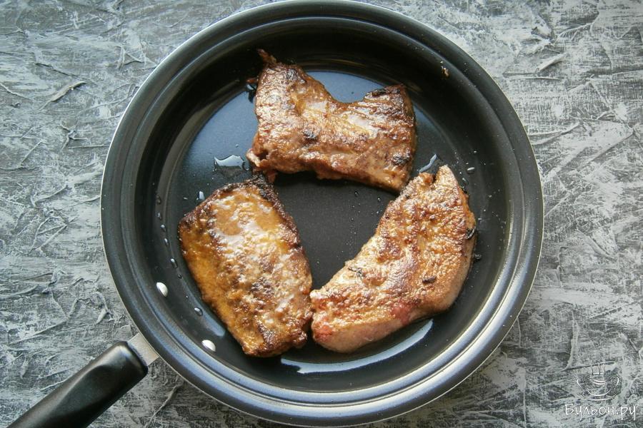 3. Выложить их в сковороду. Жарить печеночные отбивные на среднем огне по 3 мин. с каждой стороны. Должна только появиться румяная корочка, долго печенку жарить не нужно.