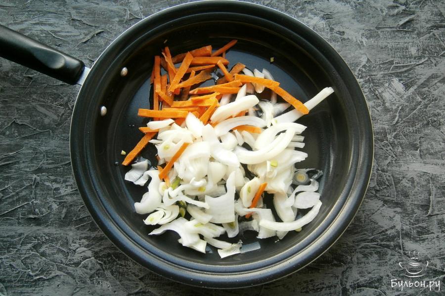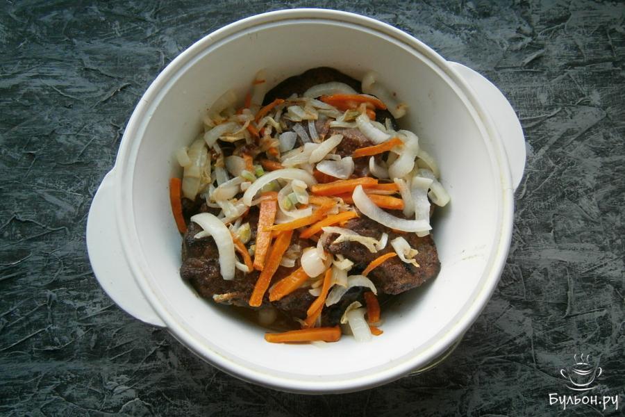 7. Выложить овощи поверх печени, влить немного горячей воды. Теперь, кастрюльку накрыть крышкой и отправить в микроволновую печь на 2-3 минуты при полной мощности.