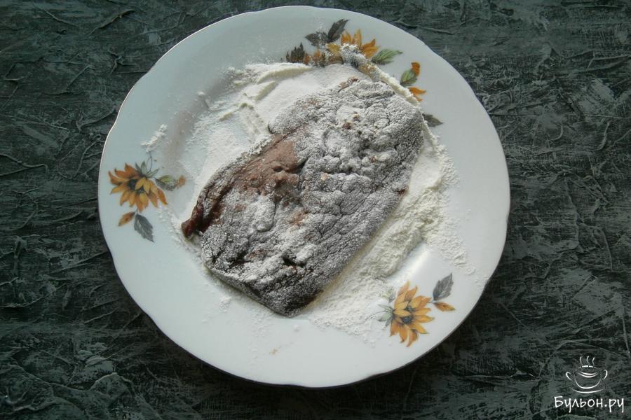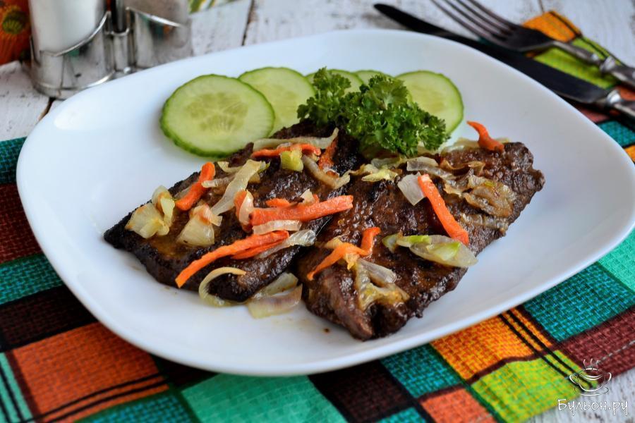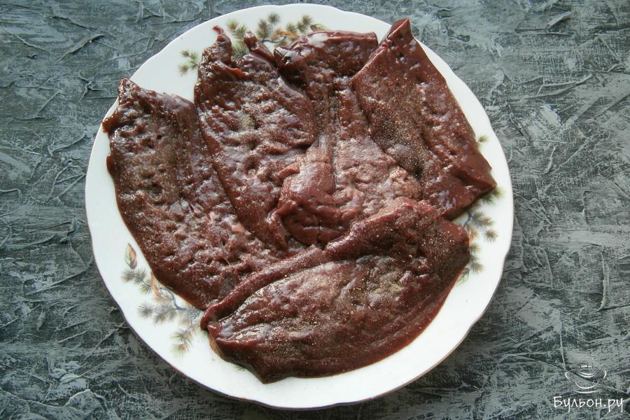 1. Свиную печенку разрезать на довольно большие, но тонкие части, как на обычные отбивные. Отбить немного молоточком, прикрыв пленкой, посолить, а также, поперчить.