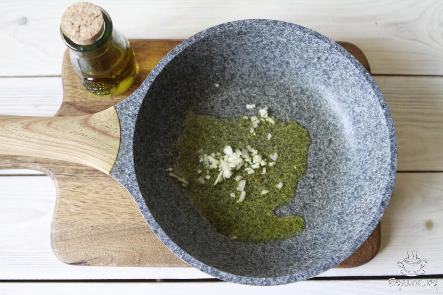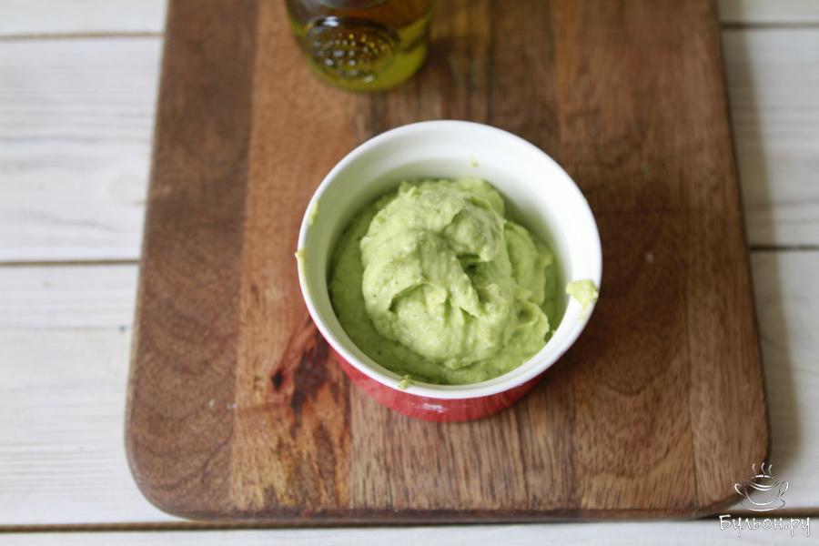 2. Приготовление лучше всего начать с соуса. Авокадо почистить и переложить в стакан блендера, добавить чуть меньше 2 ст. л. оливкового масла, травы и соус табаско по вкусу.