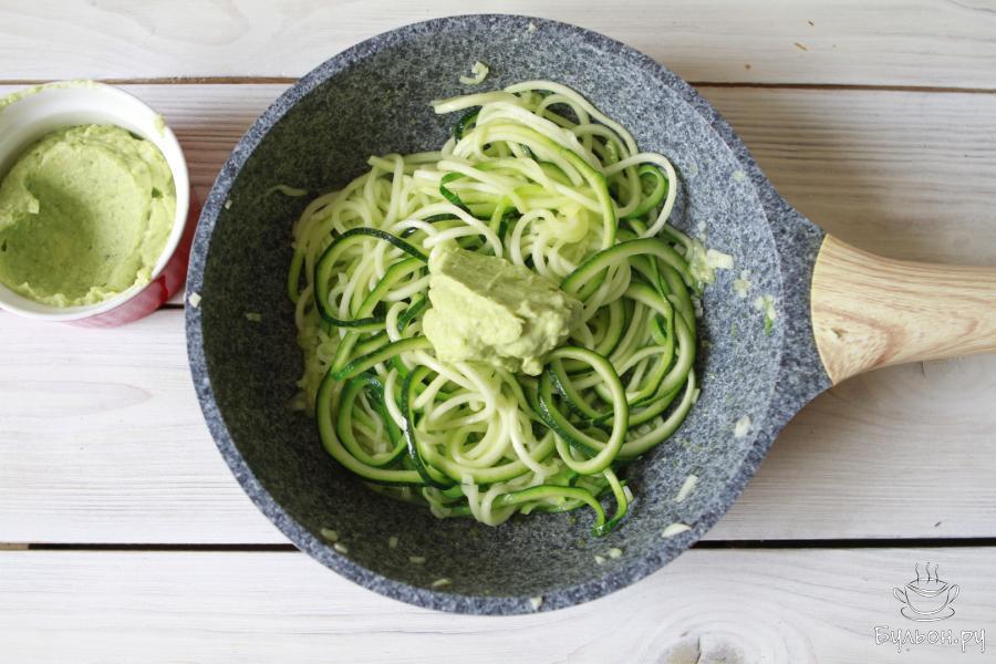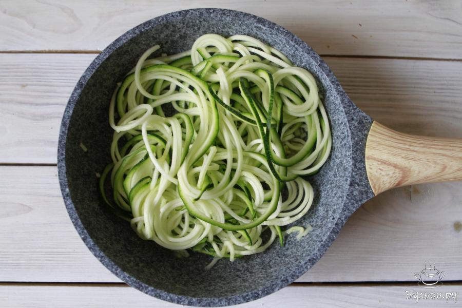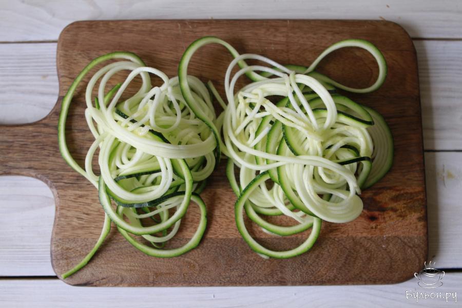 5. Нарезать лапшу из цуккини. Удобнее это сделать при помощи специальной овощерезки, либо же вручную ножом.