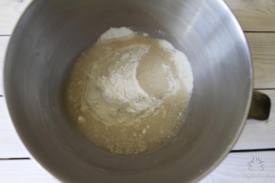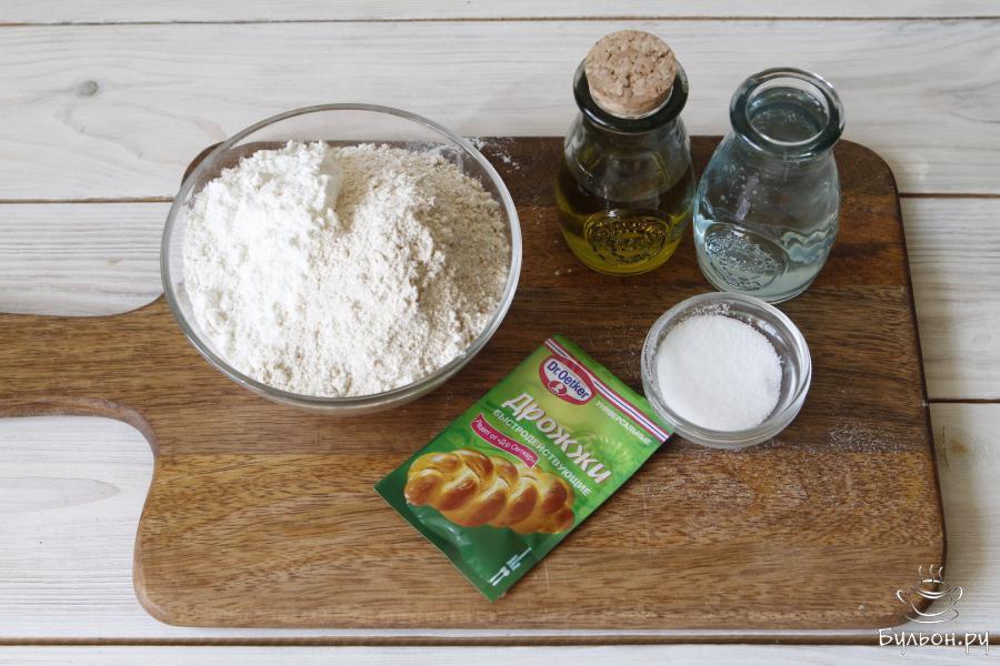 1. Для приготовления теста подготовить следующие ингредиенты: муку двух видов, сухие дрожжи, соль, воду и оливковое масло.