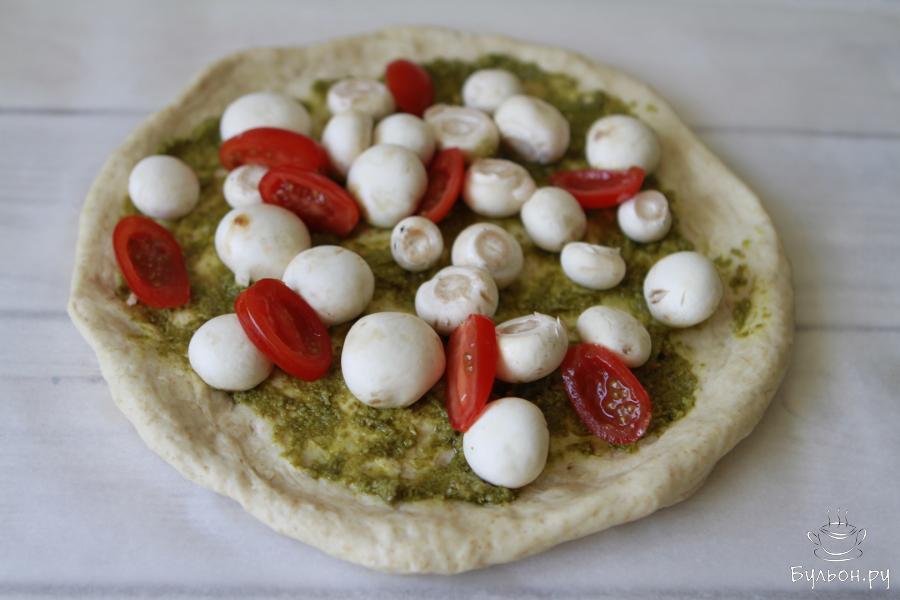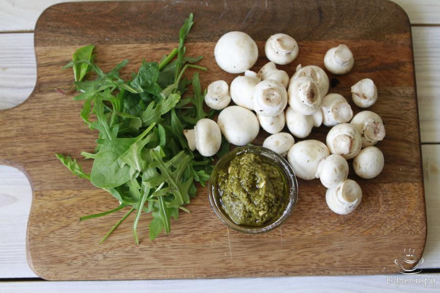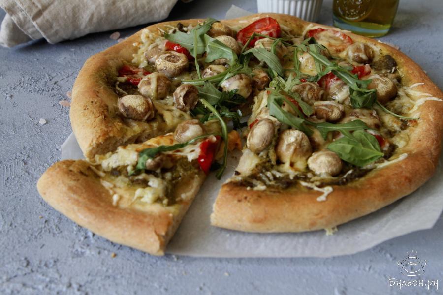 9. Пицца с грибами и соусом песто готова. Подавать ее желательно в горячем виде, украсив листьями рукколы. Приятного Вам аппетита.