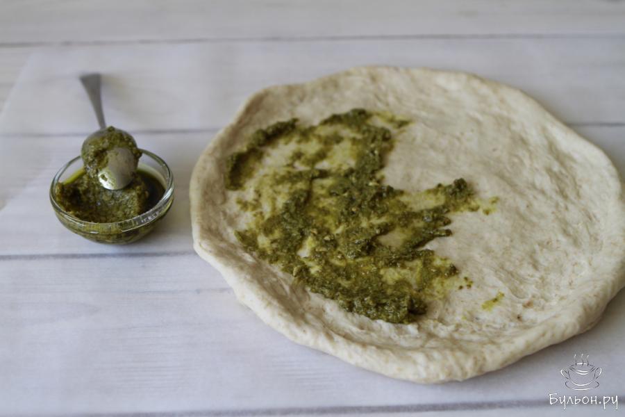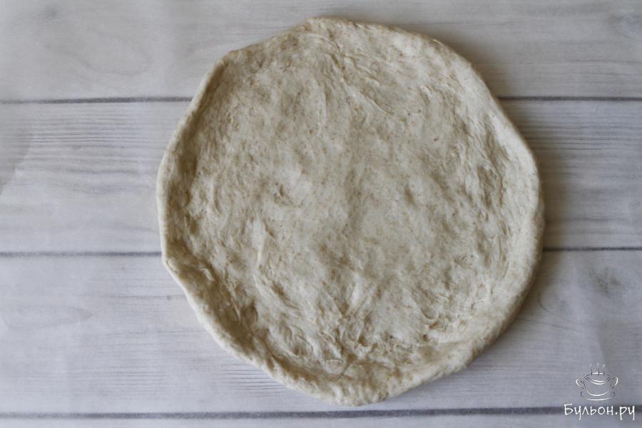 4. Тесто разделить на две части. Вручную растянуть тесто в круг, формируя бортики диаметром, примерно, 25 см.