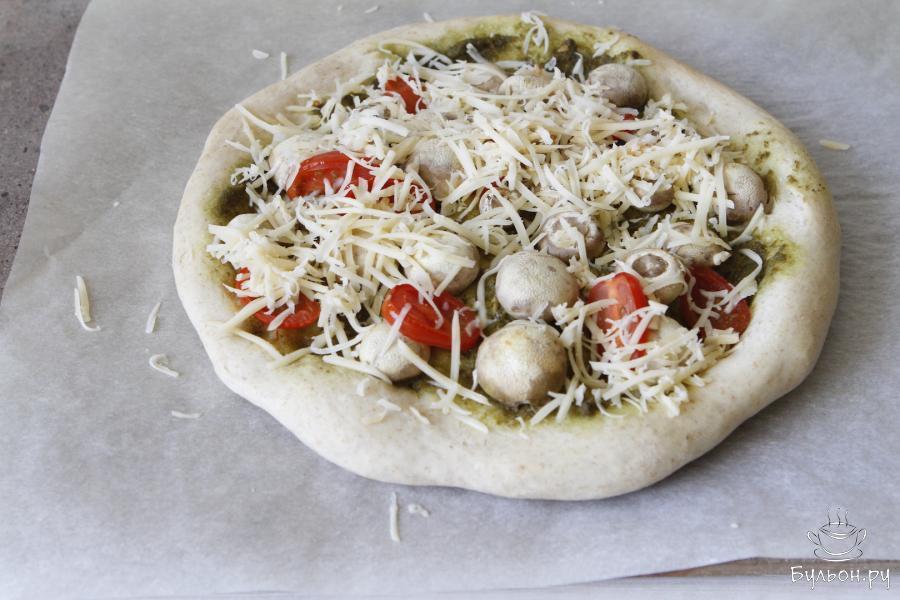 8. Переложить пиццу на камень для выпечки, присыпать тертым сыром и отправить в заранее разогретую духовку на 20 минут. Выпекать при температуре 180 градусов.