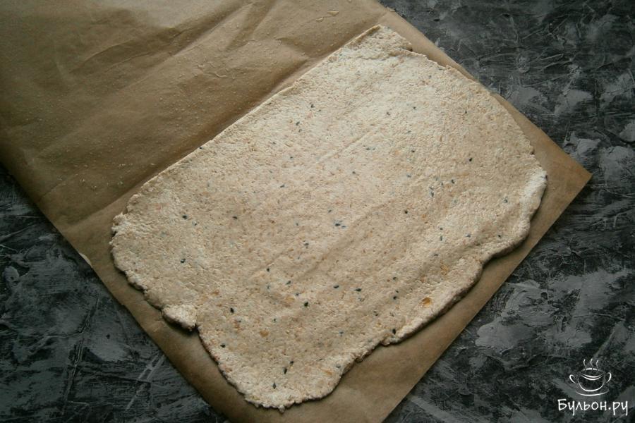 5. Тесто выложить на половину листа пергамента, смазанного растительным маслом, накрыть второй половиной. Скалкой раскатать тесто до толщины около 0,3 см.