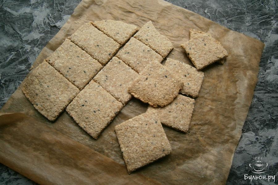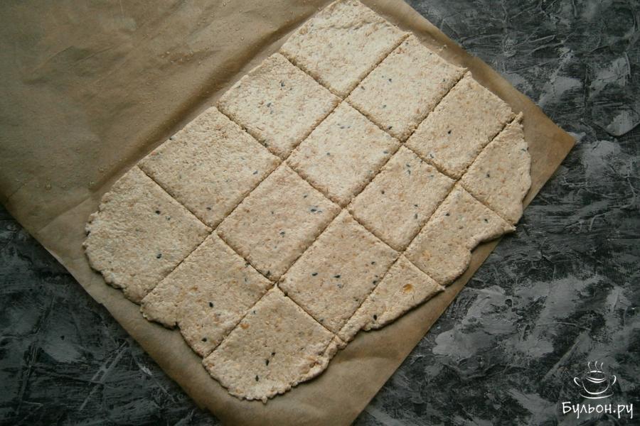 6. Ножом порезать раскатанное тесто на квадратики или прямоугольники и в таком виде, прямо на пергаменте, поместить все на противень. Выпекать хлебцы при 180 град. около 30 мин.