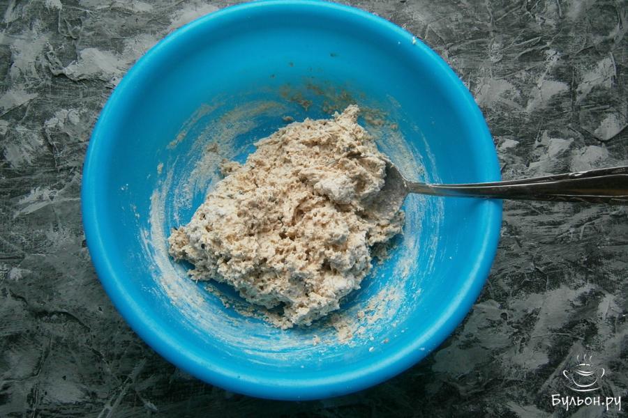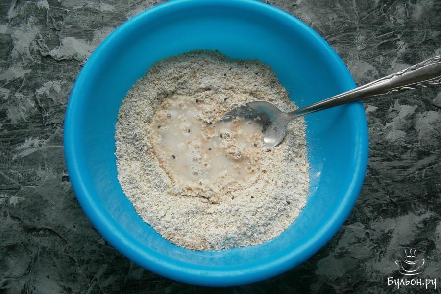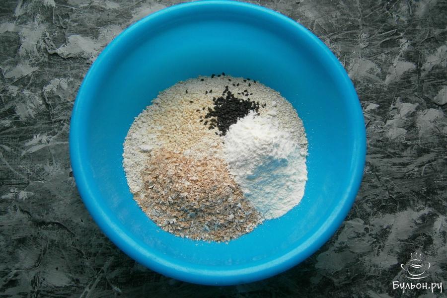 2. Добавить любые отруби, пшеничную муку, семена кунжута - я взяла и белый, и черный пополам, всыпать немного соли.
