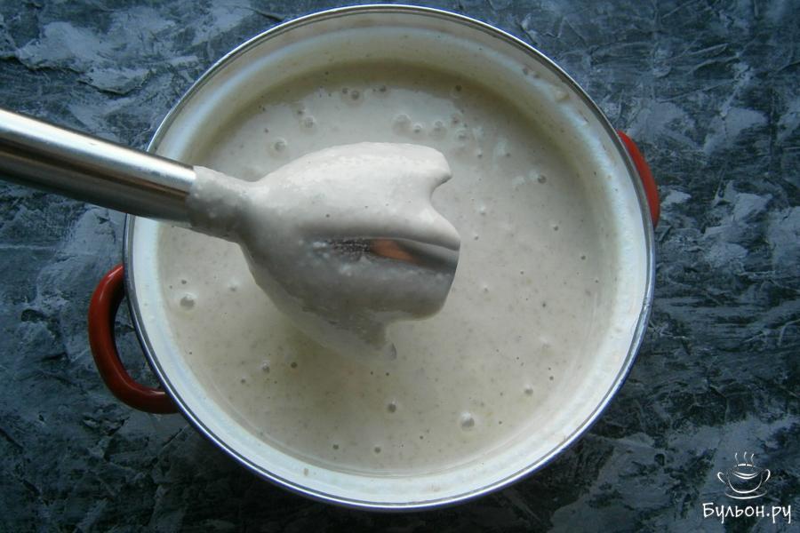 6. Затем, все тщательно пюрировать погружным блендером. Консистенция супа должна быть кремовой и достаточно густой. Если суп слишком густой, разбавить его можно оставленным отваром из картофеля. Довести суп на небольшом огне до кипения и отставить.