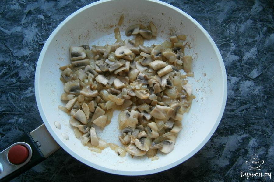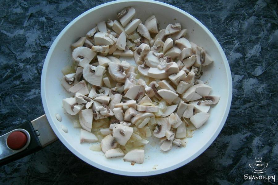 4. Обжарить все вместе в течение 4-5 минут. Грибы не нужно зажаривать, они должны остаться светлыми.