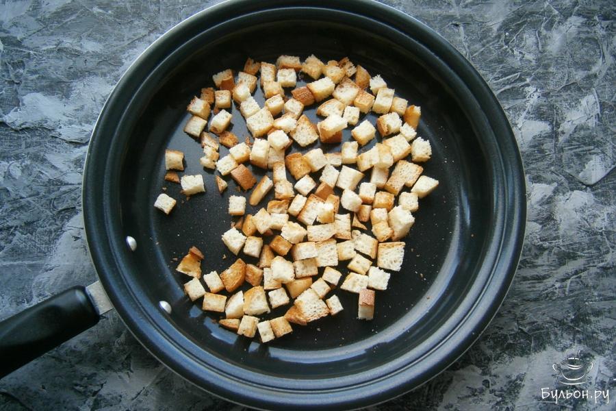 7. Для подачи, из нарезанного маленькими кубиками белого хлеба или батона можно пожарить на сухой сковороде сухарики.