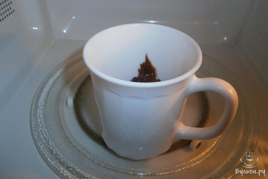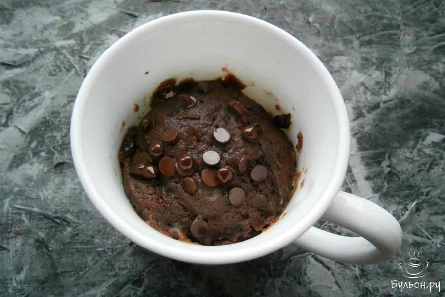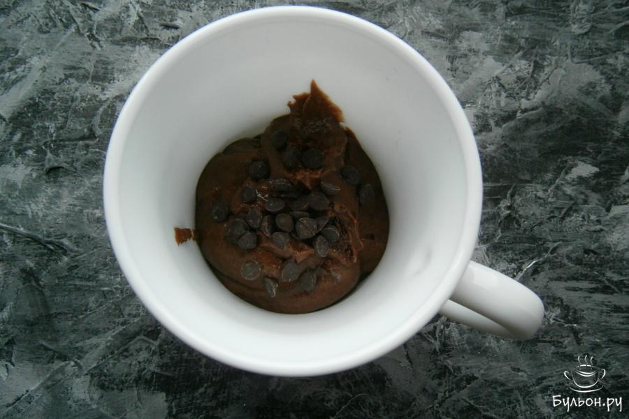 6. Выложить тесто в кружку или формочку на половину объема, которые предназначены для готовки в СВЧ, сверху посыпать немного тертым шоколадом или шоколадными каплями.