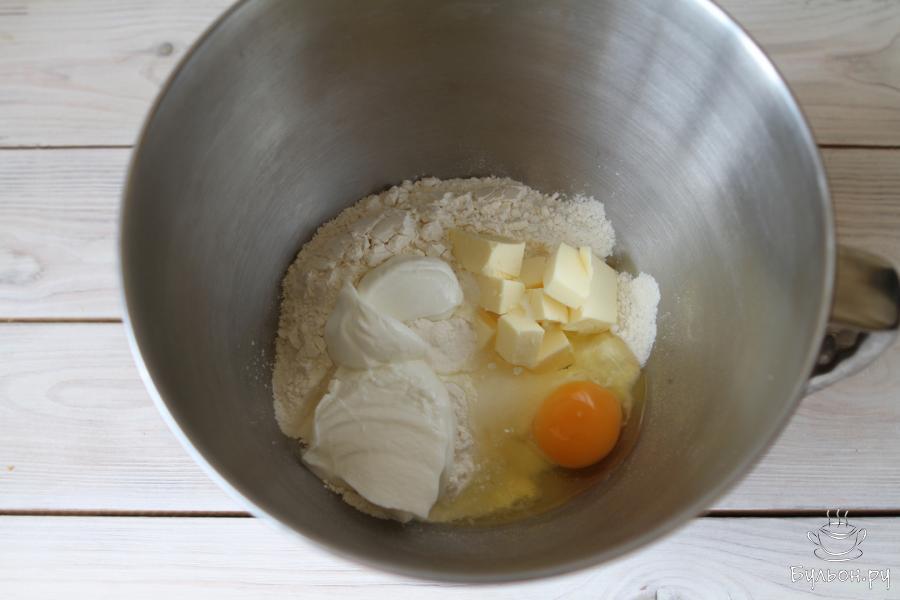 1. Приготовить все ингредиенты по списку. В чашу миксера переложить муку пшеничную, сливочное масло комнатной температуры, яйцо, йогурт, соль.