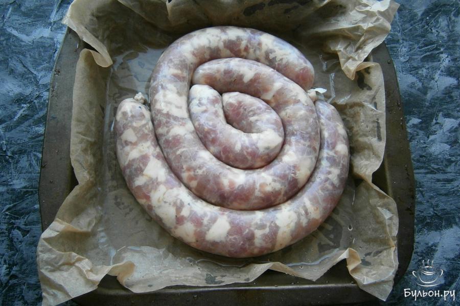 6. Любую подходящую форму застелить бумагой пергаментной, выложить колбасу, влить немного обычной воды (достаточно 50 мл).