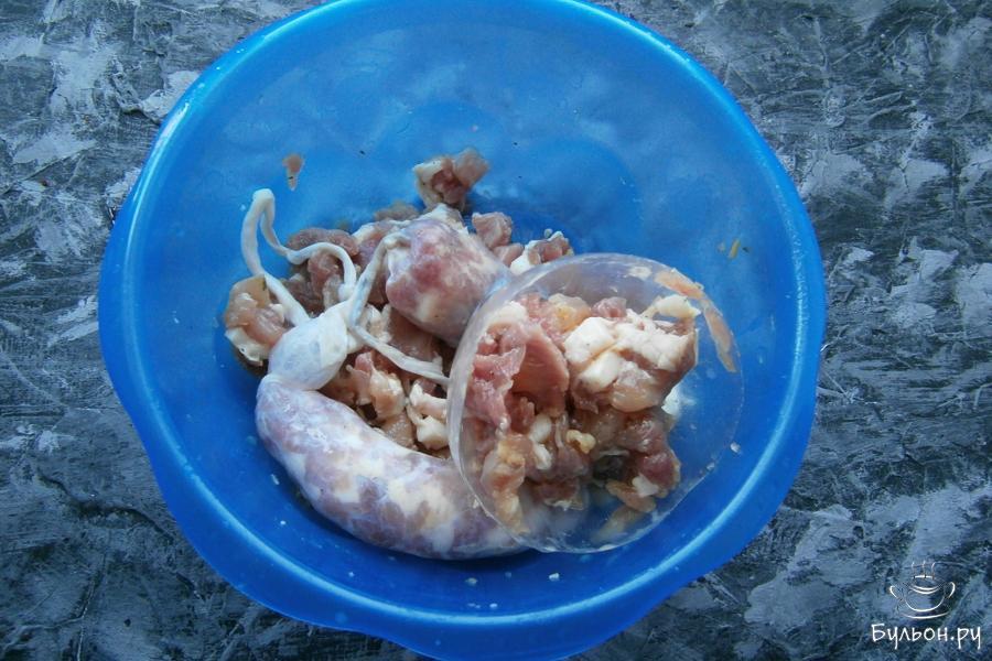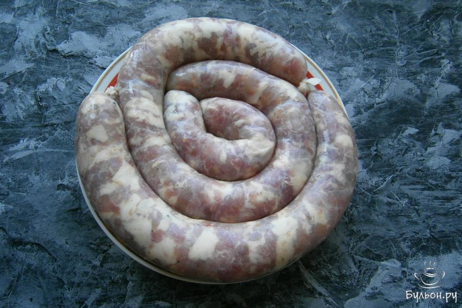 4. Начинить мясным фаршем подготовленные кишки любым удобным для вас способом. Набивать кишки туго нельзя, нужно оставлять немного пространства.