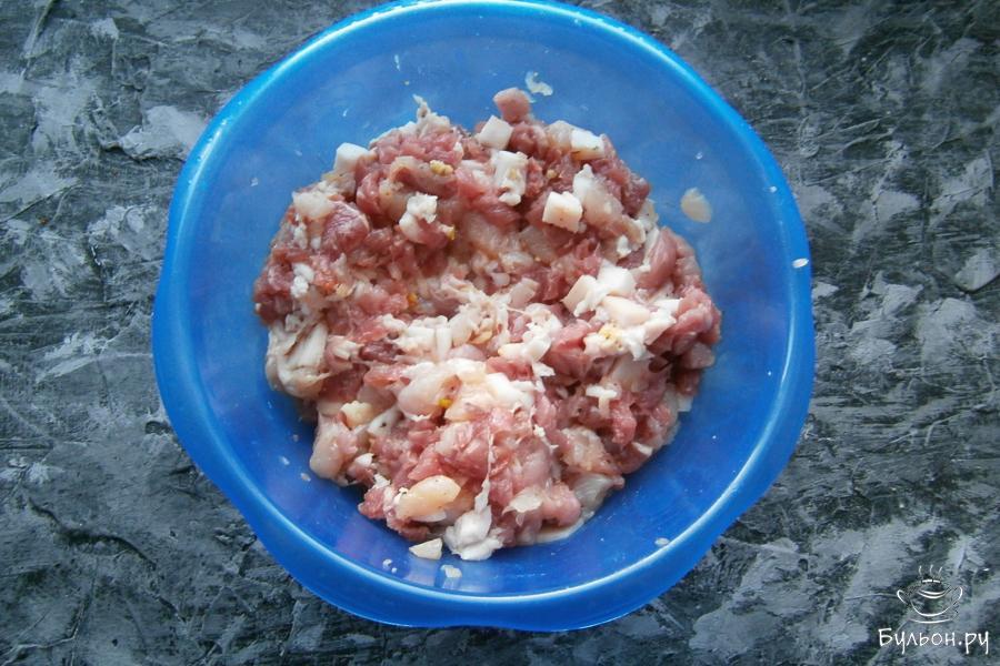 2. Добавить соль, измельченный чеснок, всыпать все специи, фарш хорошо вымешать. Вымешивать нужно минут 10-15, чтобы он стал липким.