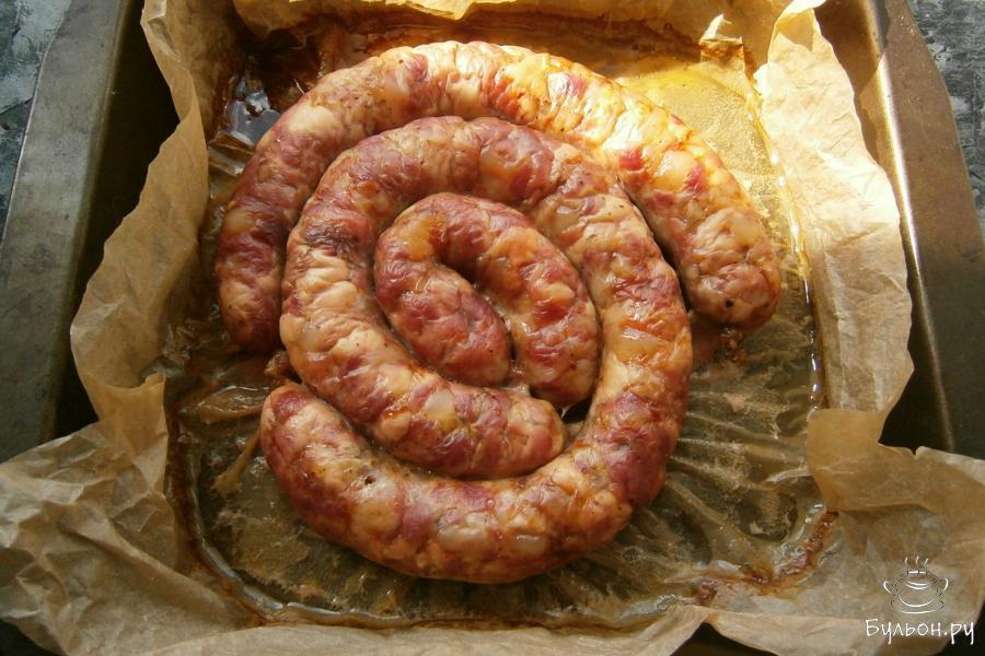 7. Колбасу поместить в холодную духовку, выставить температуру 180 град. и запекать ее в течение 1 часа 15 минут.