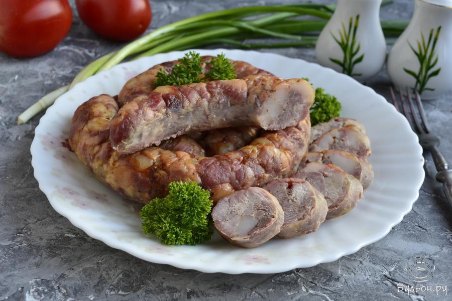 8. Готовой колбаске дать остыть, поместить ее в пергамент и отправить на несколько часов в холодильник. Приятного аппетита.