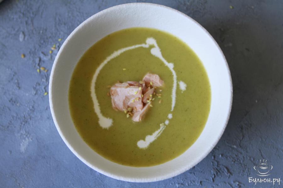6. Суп-пюре разлить по тарелкам, сверху выложить кусочки лосося. Суп готов к подаче. Приятного Вам аппетита.
