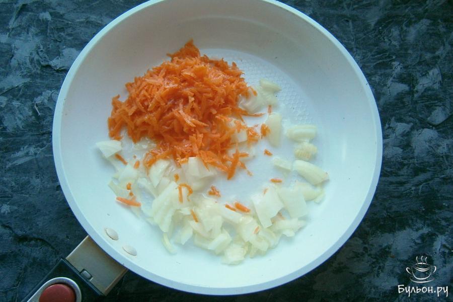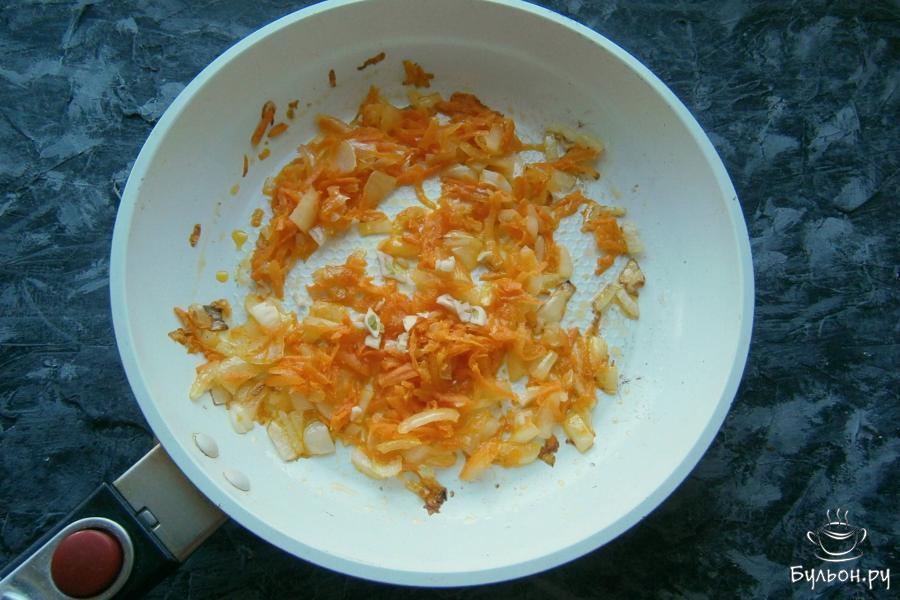 1. Лук нарезать произвольными кусочками, морковку натереть. Овощи разместить в сковородке или сотейнике с любым растительным маслом.