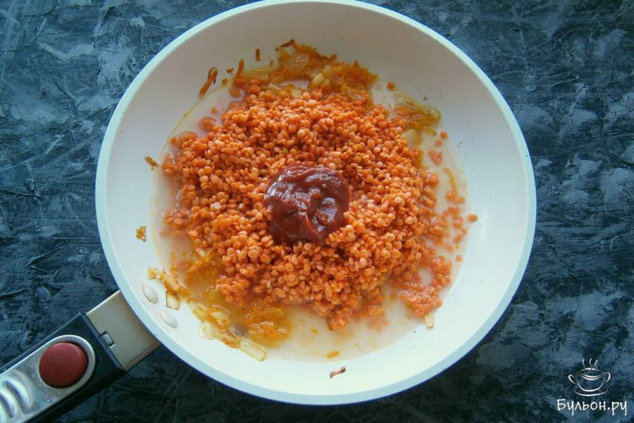 4. Добавить к овощам чечевицу и томатную пасту или томатный соус, все перемешать и обжаривать несколько минут.