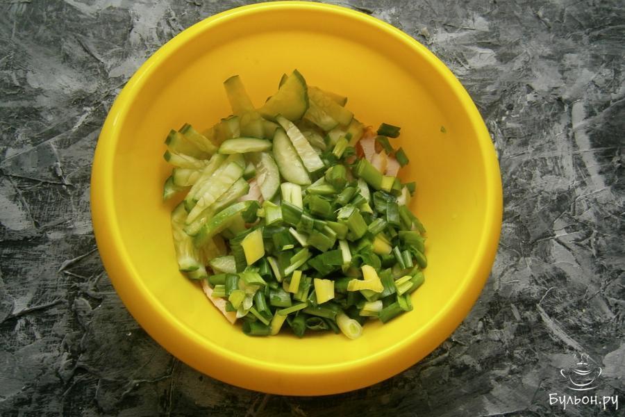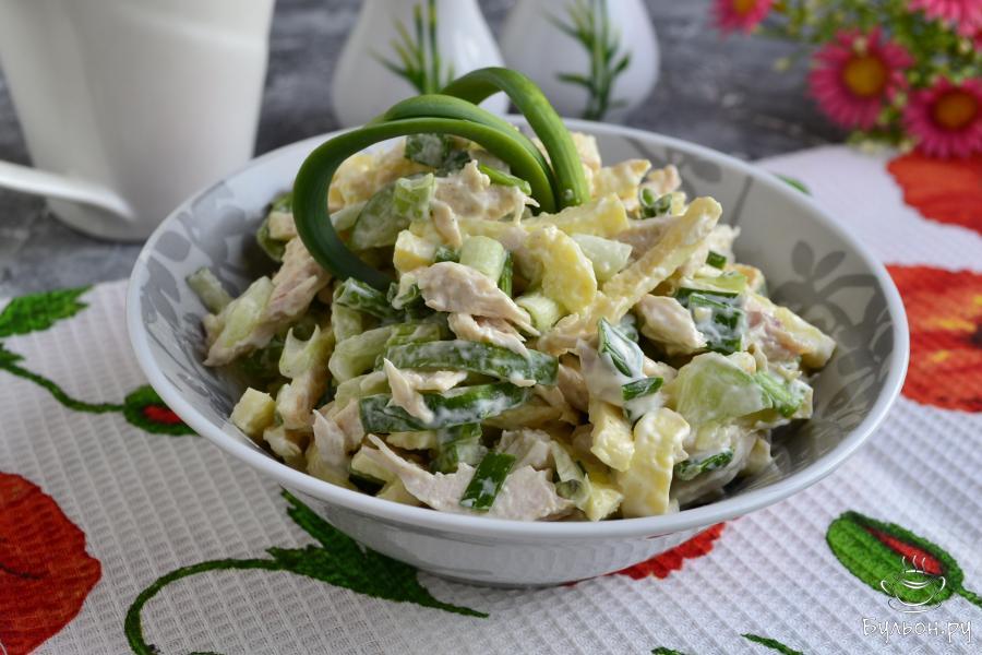 Наверное самое распространенное блюдо и в будни, и в праздники - это салат, вариантов приготовления которого существует великое множество. Салаты бывают овощными, мясными, рыбными, грибными, смешанными или слоеными, легкими и довольно калорийными. Предлагаю вам свежий, интересный, необычайно вкусный, достаточно сытный, но в то же время и легкий салатик, в составе которого присутствует отварная курочка и яичные блинчики. Как раз эти самые блинчики придают салату свою изюминку, ваши родные и гости не сразу догадаются из чего он приготовлен. Обязательно попробуйте, салат замечательный.
